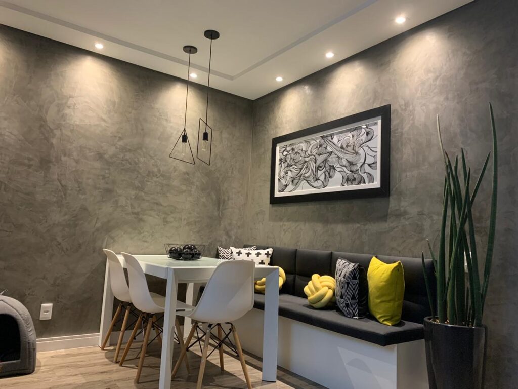O cimento queimado é incrivelmente versátil e pode ser usado tanto em pisos de salas, quartos e áreas de convivência, quanto em paredes decorativas, banheiros e até fachadas externas.